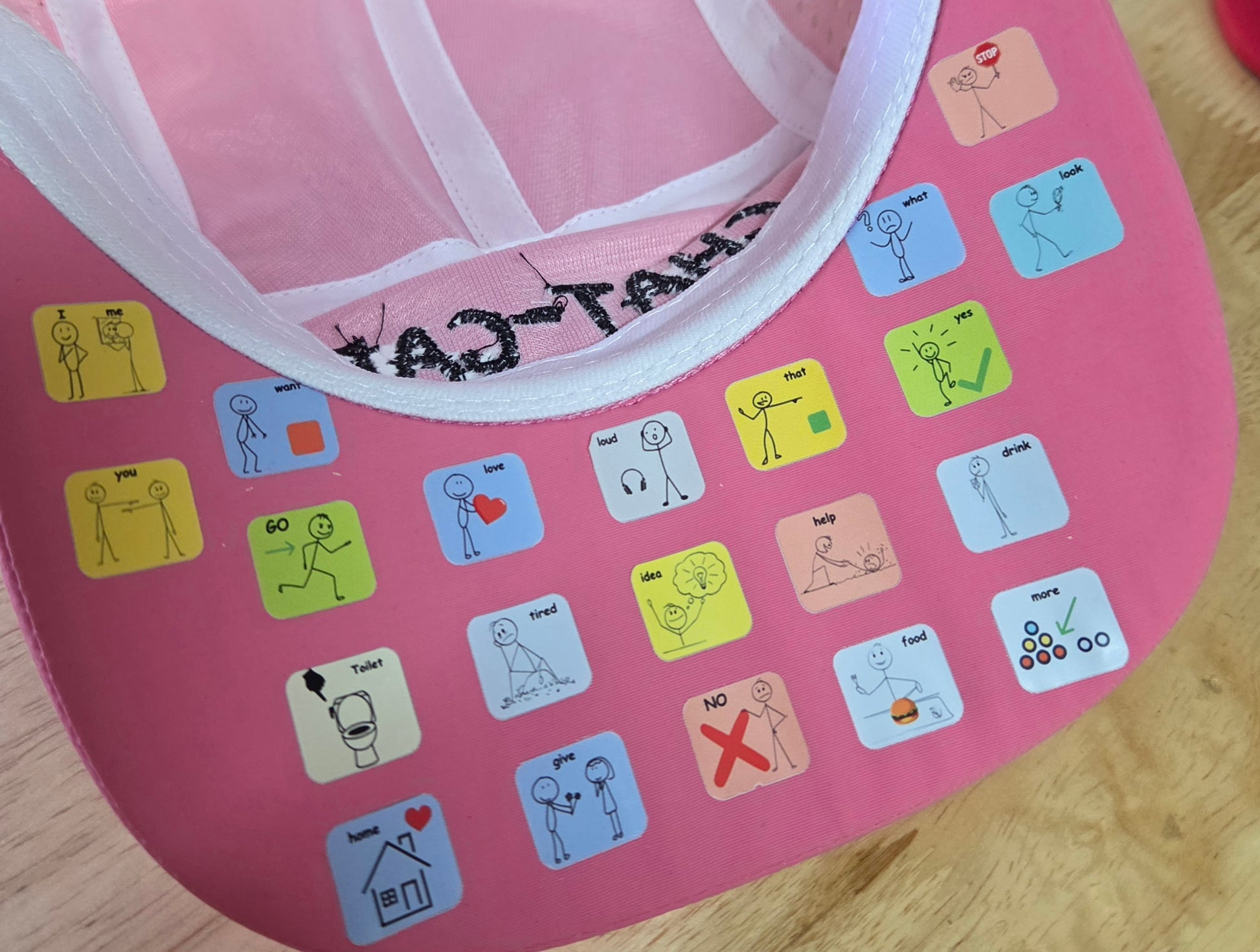 Hidden Communication Power: All 21 Action AAC icons are cleverly positioned under the peak of the cap, including communication essentials like: drink, eat, Stop, Look, What, Yes, More, Help, That, Loud, Idea, No, Give, Tired, Love, Go, Want, You, I/Me, Toilet, Home. These symbols remain completely private and discreet while the cap is being worn.